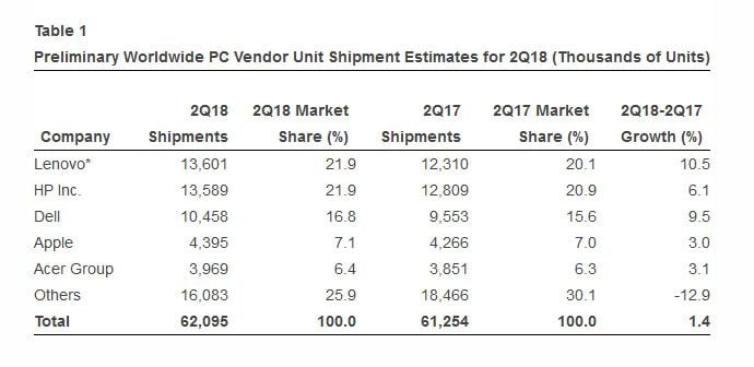 Voilà une bonne nouvelle pour les amoureux des ordinateurs « à l’ancienne » : le cabinet d’analyse de marché Gartner publie des chiffres encourageant pour le marché du PC. Au dernier trimestre (2e trimestre 2018 donc) le marché est en progression de +1,4% par rapport au second trimestre 2017 – soit plus de 62 millions de machines. Une progression modeste, certes, mais qui vient enrayer six années de baisse constante – c’est la première hausse d’un trimestre d’une année sur l’autre depuis… 2012 !