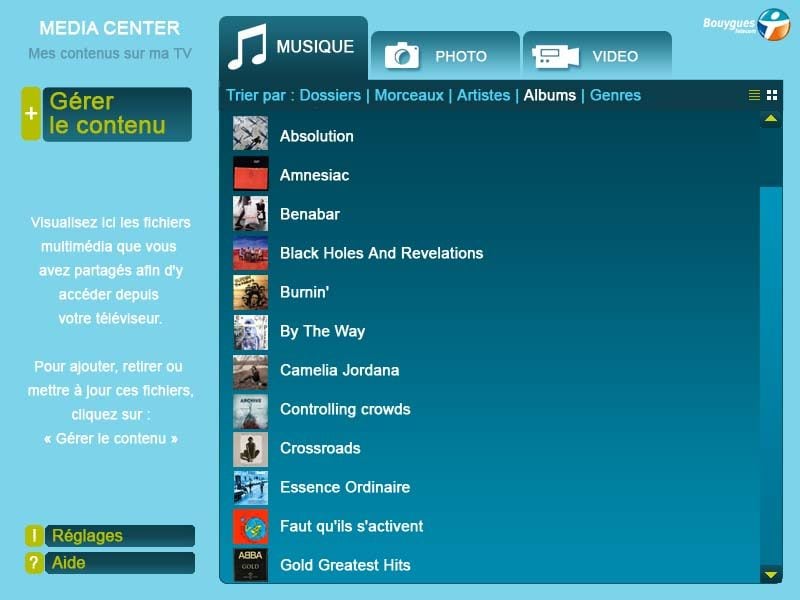 L’accès aux vidéos, musiques et photos sur le disque d’un ordinateur requiert l’installation d’un logiciel fourni gratuitement par Bouygues (disponible en ligne). Celui-ci permet d’établir le dialogue avec le media center et de sélectionner les contenus du disque dur à rendre accessible. Ce logiciel n’est cependant pas indispensable. Le media center s’appuie sur le protocole UPnP DLNA, commun à de nombreux équipements et logiciels. A commencer par le media center de Windows. Mais dans ce cas, Bouygues ne garantit pas un fonctionnement à 100 %.