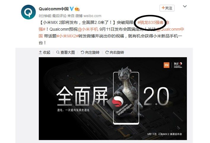 Côté processeur, le Mi Mix 2, tout comme le Mi6, le dernier flagship de Xiaomi, embarquera un processeur Snapdragon 835 comme vient de le confirmer Qualcomm sur son compte Weibo. Cette puce est la plus puissante du fondeur américain et équipe notamment les modèles haut de gamme de bon nombre de constructeurs comme le Nokia 8, le OnePlus 5, le HTC U11 ou le Sony Xperia XZ Premium. De quoi lui assurer de bonnes performances.