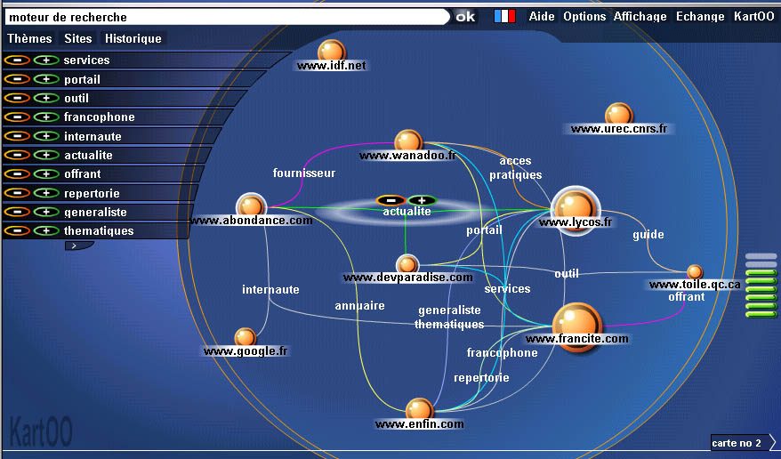 Créé il y a neuf ans par une équipe de Clermont-Ferrand, l’outil proposait une interface originale : il affichait les résultats d’une requête sous la forme d’une carte. L’internaute pouvait ainsi facilement voir les réponses, symbolisées par des sphères, et affiner ses recherches grace aux mots-clés qui s’y rattachaient.