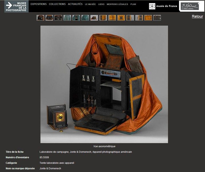 Le musée a également mis en ligne des images du matériel qu’il conserve : daguerréotype, appareil stéréoscopique, laboratoire de campagne, réflexe… Ils sont tous là, photographiés sous plusieurs angles (14 pour le laboratoire de campagne), l’internaute peut même faire une recherche par époque, par fabricant, par inventeur ou par type de matériel. Tout n’est pas en ligne, mais cela vous changera de vos téléphones-appareils photo.