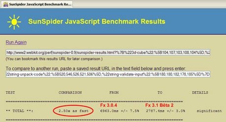 SunSpider Javascript, la bêta 2 de Firefox 3.1 est désormais 2,5 fois plus rapide que Firefox 3, alors que la première version bêta, testée en