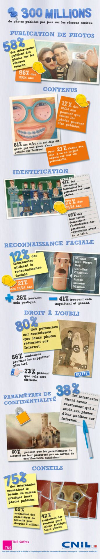 Un usage incontournable, mais où les zones grises restent nombreuses, tel est, en substance, le bilan d’une étude commanditée par la CNIL et réalisée par TNS Sofres (*) à propos du partage de photos sur Internet. Preuve qu’il s’agit d’une véritable lame de fond, 58 % des français publient des photos sur Internet pour les partager avec d’autres, et 50 % ont déjà été identifiés sur une photo par un tag.