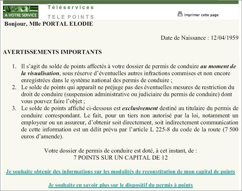 commises par l’automobiliste. Seul le nombre de points effectifs est communiqué.A ce sujet, Télépoints rappelle que ‘ le solde de points affiché […] est exclusivement destiné au titulaire du permis de conduire correspondant. Le fait, pour un tiers non autorisé par