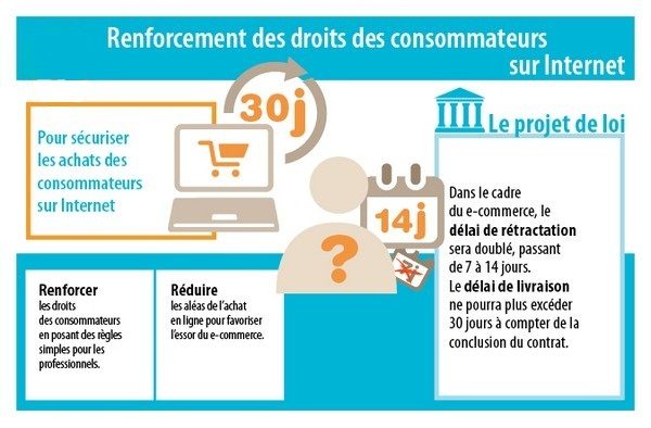 Le projet prévoit également d’intégrer dans le droit français les dispositions de la directive européenne 2011/83 du 25 octobre 2011 et ainsi renforcer le devoir d’information précontractuelle du professionnel, en particulier dans le cadre de la vente à distance. Ainsi par exemple, avant tout achat en ligne, le commerçant devra s’assurer via un bouton de commande que le consommateur a pris connaissance qu’il s’agit d’une « commande avec obligation de paiement » et ce dernier sera informé des moyens de paiement acceptés ainsi que des éventuelles restrictions appliquées.