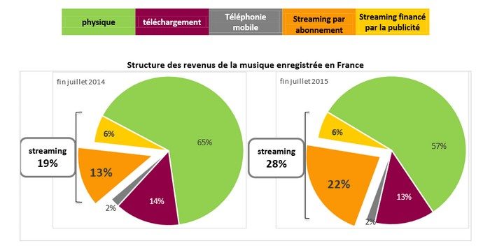 Cette progression est d’abord due à la hausse des abonnements aux plates-formes de streaming qui représentent les trois-quarts des revenus. Ainsi, selon Médiamétrie, en juin 2015 les quatre principaux services musicaux légaux ont totalisé 48,7 millions de visiteurs uniques mensuels.