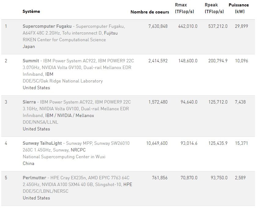 Cette force de frappe lui permet d’être quasiment trois fois plus rapide que le numéro 2 du classement : le supercalculateur américain Summit, doté de processeurs IBM Power9 et de GPU Nvidia Tesla V100. On retrouve le même type de configuration dans le troisième du classement, le supercalculateur américain Sierra.