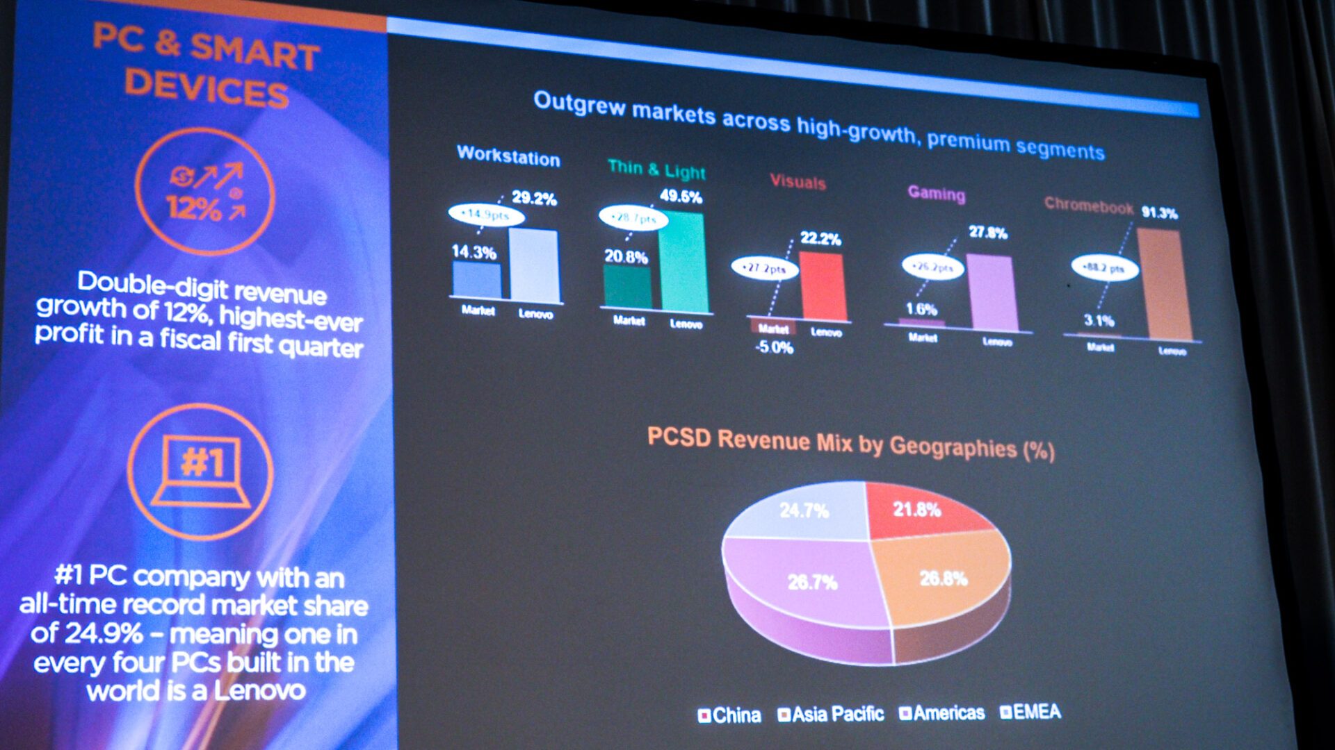 Des stations de travail aux ultra portables en passant par le segment gaming – et sans même aborder les serveurs et autres super calculateurs – tous les voyants des différentes divisions sont au vert. Le marché gaming progresse de 1,6% ? Lenovo – certes arrivé après certains acteurs – progresse de 27,8%. Sur le dernier trimestre, le chiffre d’affaire de la division PC de Lenovo progresse ainsi de 12%, une situation unique dans le monde.