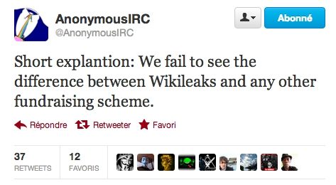 Au point que les Anonymous, qui ont jusqu’à présent toujours pris parti pour Wikileaks pour ce qu’il représente la liberté d’expression et de savoir, ont réagi assez vertement sur les différents comptes Twitter qu’ils animent.