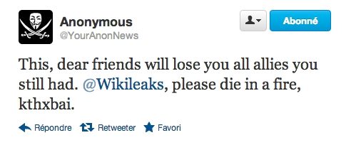 « Ceci, chers amis, vous fera perdre tous les alliés qui vous restait. @Wikileaks, s’il vous plaît mourrez brûlé. Ok, merci, au revoir. »