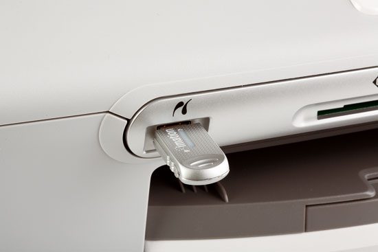 On aime… le port USB HostEn plus d’un lecteur de cartes mémoire, les modèles Brother sont équipés d’une prise USB Host : celle-ci permet de brancher une clé USB et d’imprimer les images qu’elle contient sans passer par un