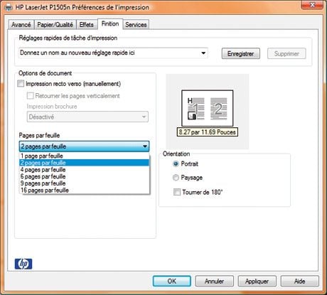 début d’explication. La possibilité de gérer les nuances de gris, de composer des cahiers, d’imprimer plusieurs pages par feuille et le recto-verso manuel sont parmi les fonctions offertes. Le pilote fournit, en outre, une aide particulièrement