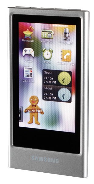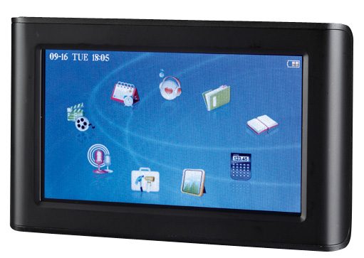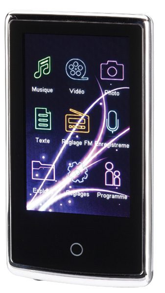 L’écran tactile affiche des widgets, des icônes animées qui représentent chacune une des fonctions du baladeur (vidéo, musique, radio, lecteur Flash, agenda…).
