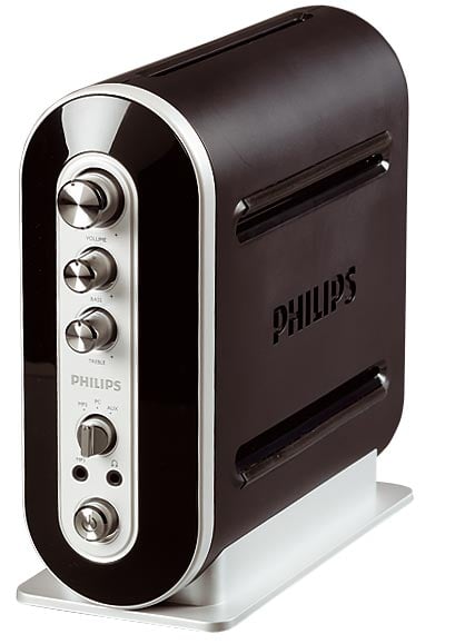 Philips est le seul constructeur à avoir opté pour un boîtier de contrôle déporté. Il regroupe tous les connecteurs et les boutons de réglage, ainsi qu’un amplificateur et l’alimentation secteur. Les boutons métalliques de contrôle du volume, des graves et des aigus respirent la qualité, et le SPA9200 est le seul kit à disposer de deux entrées audio (dont une entrée RCA) en plus de celle le reliant au PC. Une molette sert à sélectionner l’entrée active (MP3, PC ou AUX). Le centre de contrôle n’est pas pour autant la panacée : il occupe beaucoup de place sur le bureau.