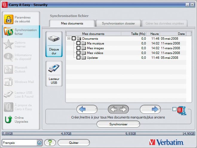 Le logiciel CarryItEasy offre une fonction de chiffrement des données, et permet aussi de synchroniser le contenu des dossiers de votre choix entre la clé et le disque dur de votre ordinateur (par exemple, le dossier Mes documents).
