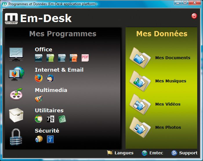 La clé d’Emtec contient la suite de logiciels portables Em-Desk qui répond à la plupart de vos besoins. Cette suite inclut OpenOffice pour la bureautique, Sumatra pour la lecture de fichiers PDF, Firefox et Thunderbird (navigateur Internet et messagerie), VLC (lecteur multimédia), Sunbird (agenda), 7 – Zip (compression) et Cornice (explorateur d’images). La sécurité n’est pas oubliée, avec un antivirus (ClamWin) et un programme de chiffrement (TrueCrypt). Bref, c’est un véritable bureau mobile !