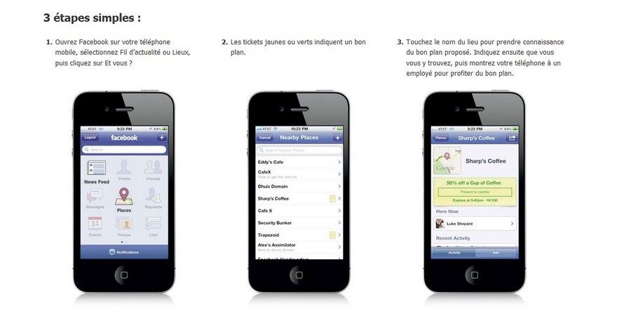 A leur tour les 20 millions de membres de Facebook en France, où du moins ceux qui s’y connectent avec leur mobile, vont pouvoir bénéficier de « bons plans ». Le réseau social décline Deals dans 5 pays, dont celui qui a vu naître Molière. Lancé outre-Atlantique en novembre 2010, ce service permet aux utilisateurs du site de bénéficier, dans des boutiques physiques, de promotions ou de réductions. Pour cela, ils doivent se localiser dans Places. Cette fonction du réseau social permet à ses membres d’indiquer l’endroit où ils se trouvent dans le but de savoir lesquels de leurs amis pourraient se trouver à proximité.