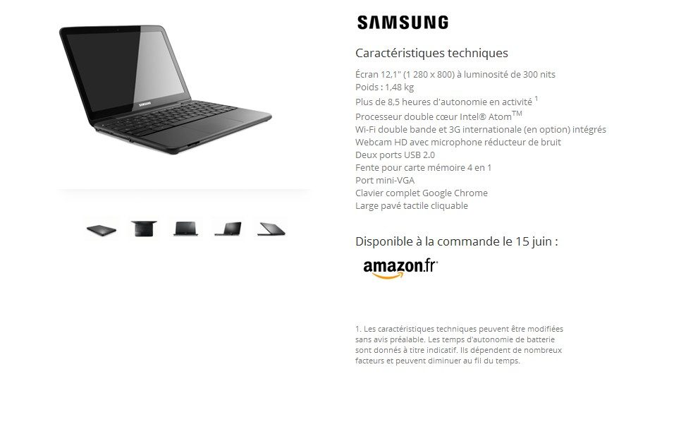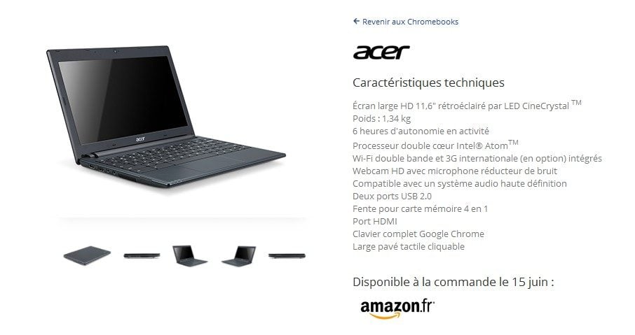 Lors de la deuxième journée de sa conférence I/O, mercredi 11 mai, Google était très attendu sur Chrome OS, son futur système d’exploitation pour ordinateurs portables, annoncé il y a près de deux ans. La firme de Mountain View a dévoilé ses Chromebook, des machines « conçues et optimisées pour le Web ». Samsung et Acer fabriqueront les premiers modèles, qui seront commercialisés dans plusieurs pays, dont la France, à partir du 15 juin prochain. Dans l’Hexagone, ils seront disponibles sur Amazon.