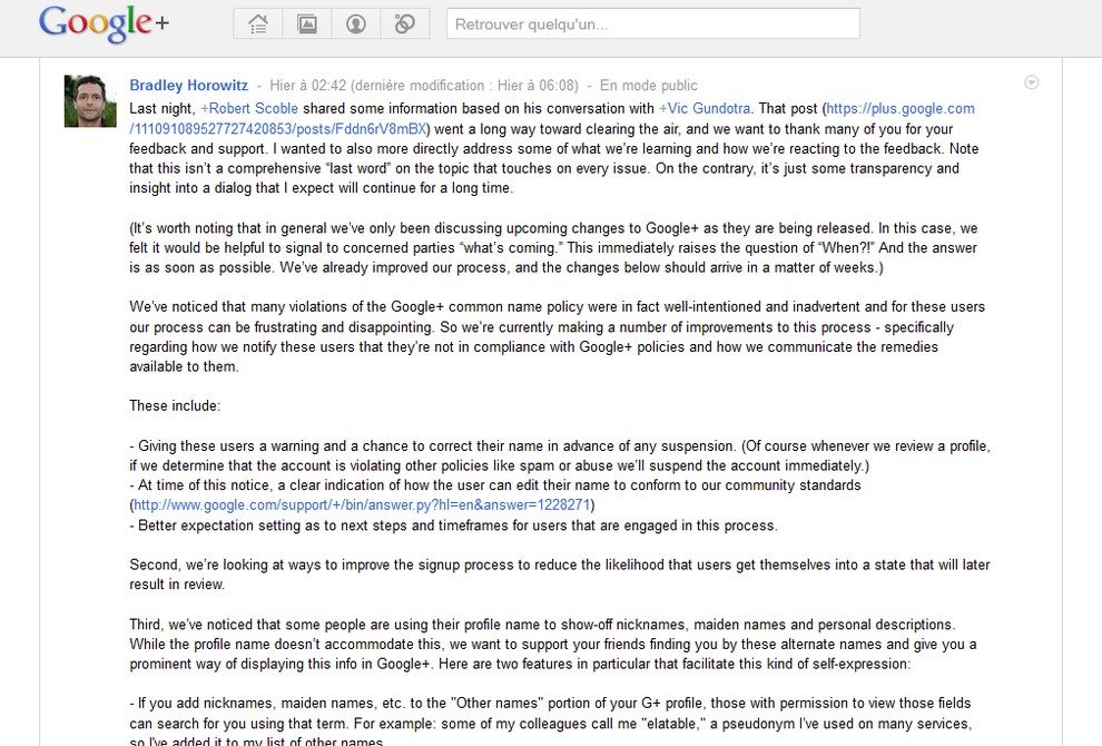 Bradley Horowitz promet d’autres changements à venir. Et revient sur deux informations qu’il juge erronées. Celle qui voudrait que Google ne se préoccupe pas des entreprises ou des organisations (qui ne peuvent pas créer de comptes pour l’instant), il rappelle que Google+ n’a que quelques semaines d’existence et promet des fonctions adaptées « pour différents cas » dans le futur. Par ailleurs, il dément que les suspensions de comptes Google+ empêche les internautes concernés d’accéder aux autres services comme Gmail ou Docs.
