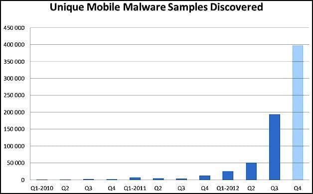 – Les attaques de type drive-by download : elles sont apparues pour la première fois sur les mobiles en 2012 et il est probable qu’elles augmentent cette année. Une attaque drive-by download consiste à installer secrètement un logiciel sur l’appareil d’un utilisateur. Une fois l’application ouverte, les criminels ont libre accès à l’appareil.