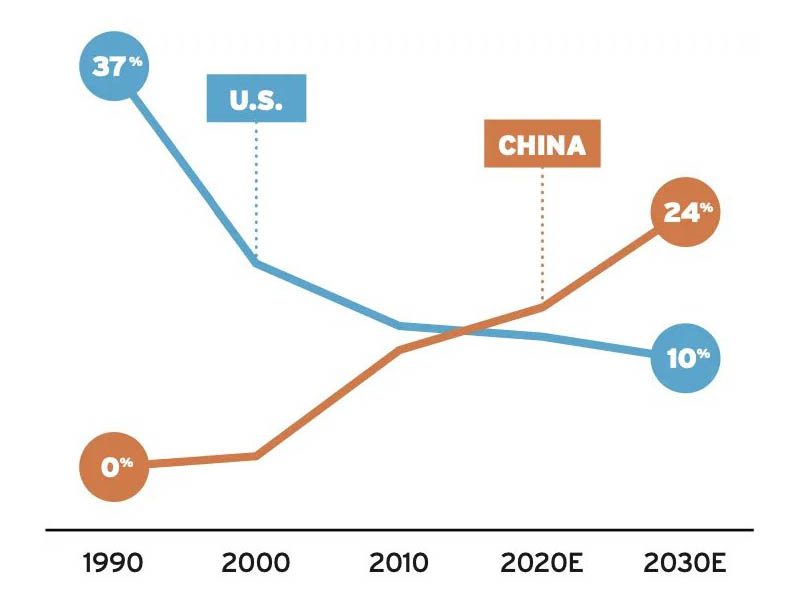 Car ils savent ce qu’ils doivent à leur domination mondiale dans le domaine des semi-conducteurs. Une domination toujours d’actualité, mais menacée par la perte de l’outil industriel. Alors que plus d’un tiers des puces vendues dans le monde étaient produites aux USA en 1990 (contre rien du tout côté chinois !), les Américains produisent désormais moins de 15% du volume global. Et la Chine, qui a dépassé les USA en volume en 2016, pourrait représenter 24% du total mondial d’ici 2030.