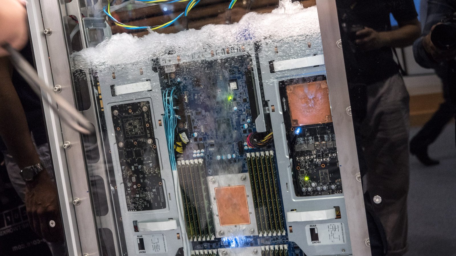 Le refroidissement à eau existe depuis Mathusalem, mais si l’immersion des composants n’est pas une première, c’est toujours un peu exceptionnel de voir un énorme rack serveur faire de grosses bubulles. Cette technique dite d’ « immersion cooling » ou refroidissement par immersion, consiste à plonger les composants dans un fluide non conducteur – ici une solution de Gigabyte dans un liquide concocté par le géant de la chimie 3M.