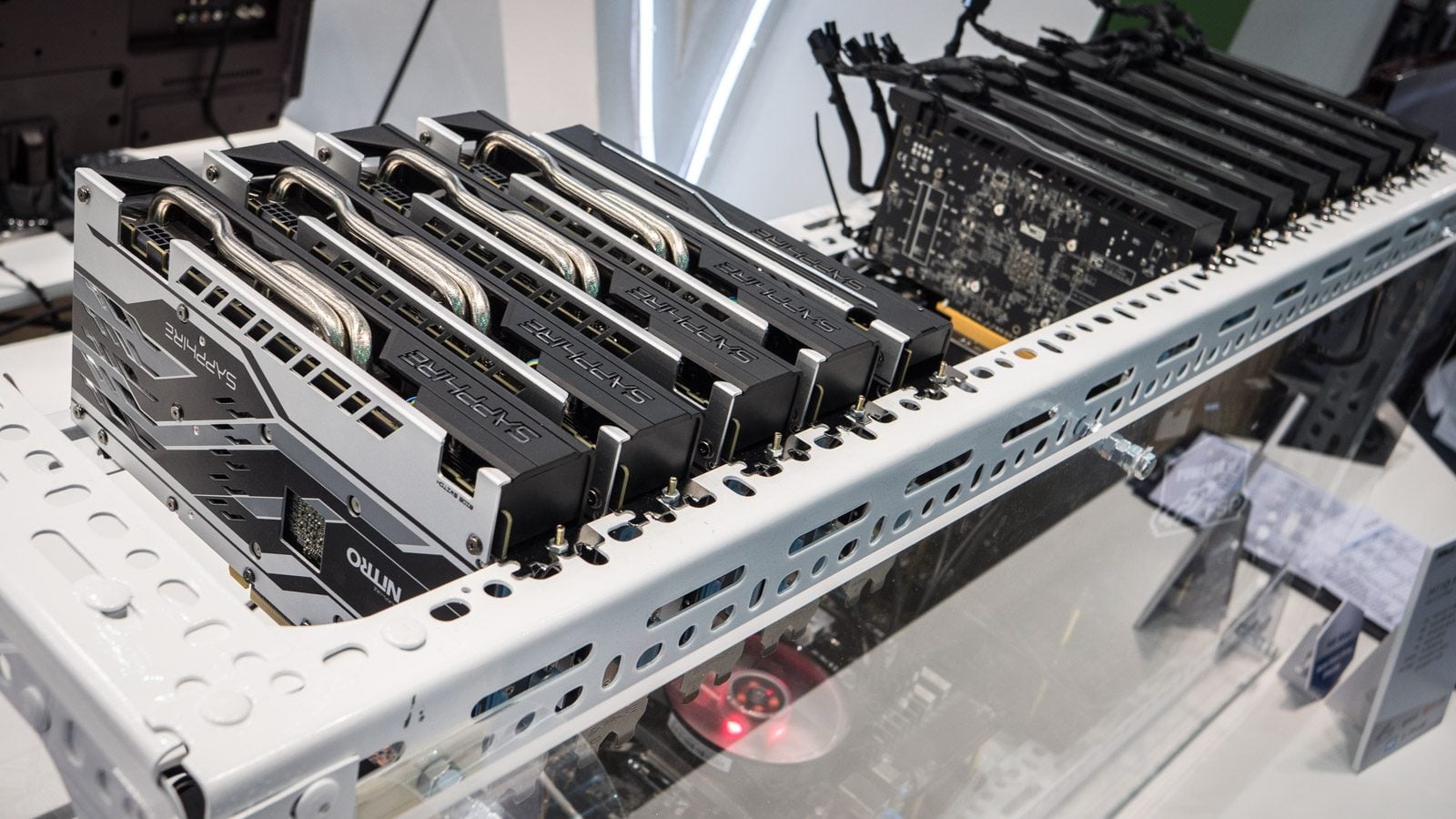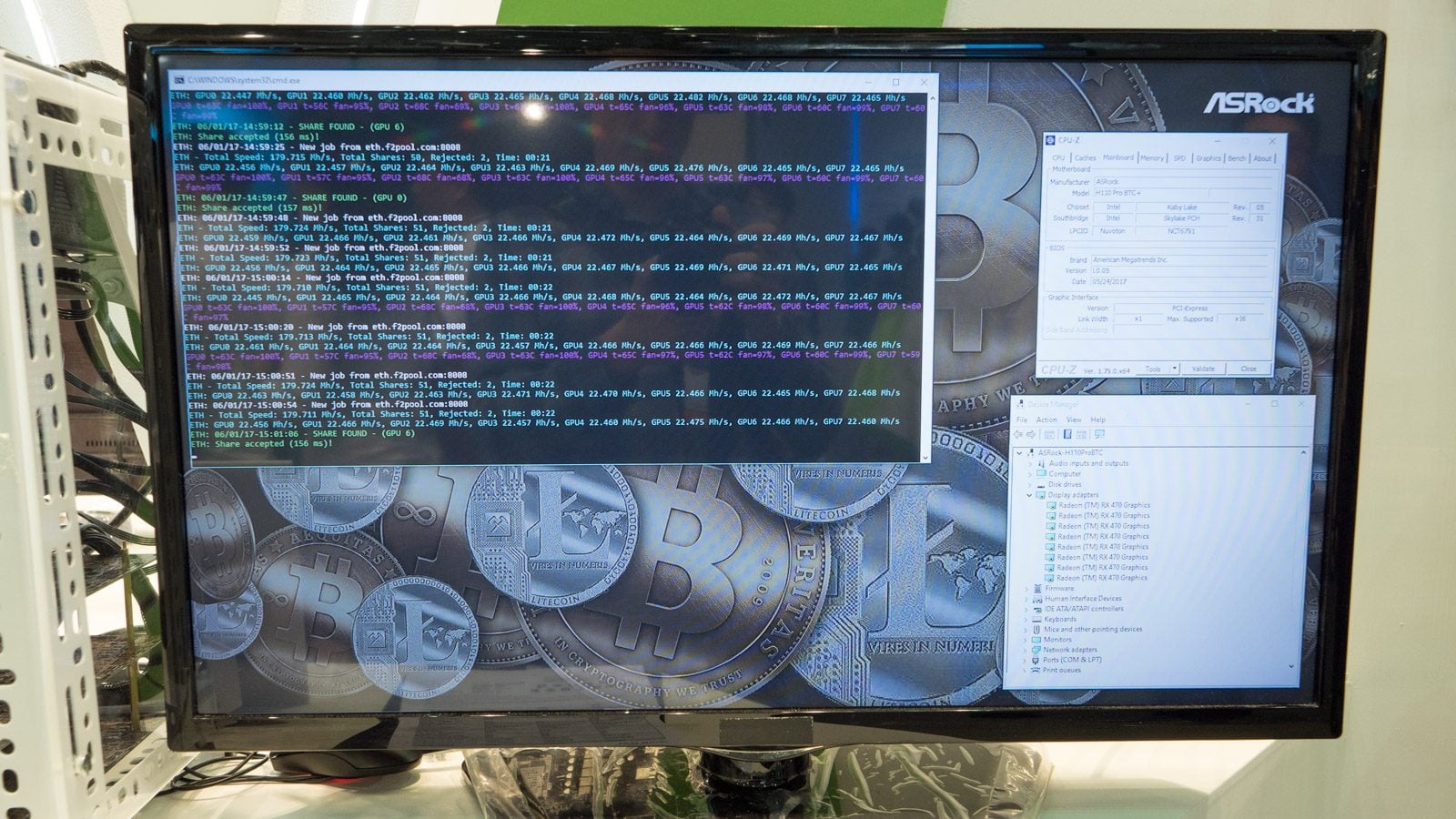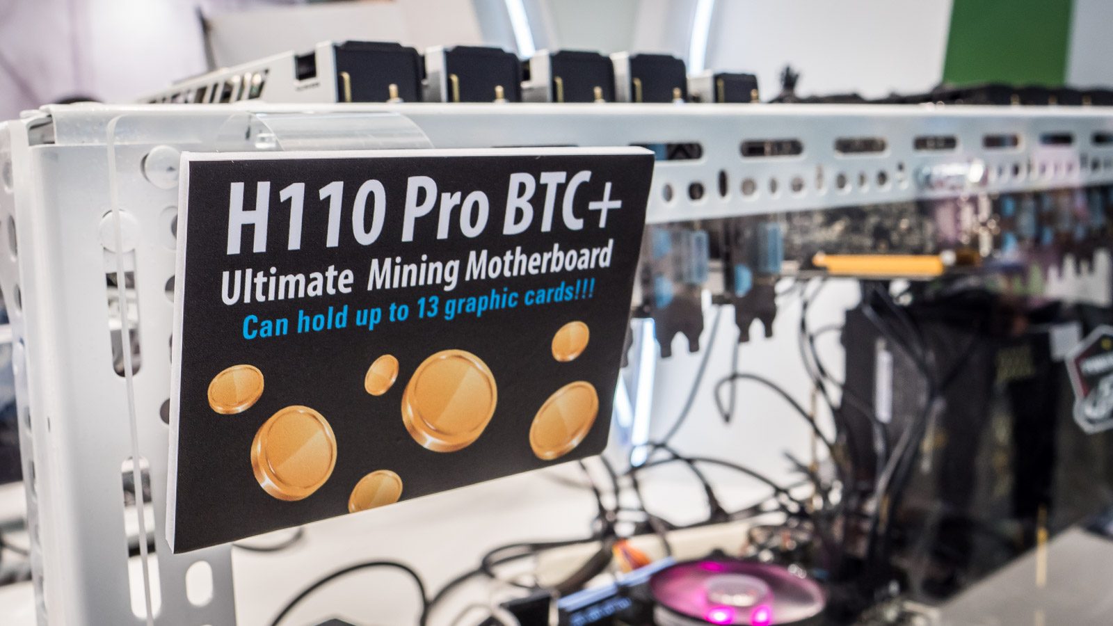 Pas besoin de 13 cartes graphiques pour jouer à Doom, mais cette débauche de puissance peut permettre de gagner de l’argent : sur le stand d’Asrock, voici le H11 Pro BTC+, une machine dédiée au « mining » de la célèbre crypto-monnaie.