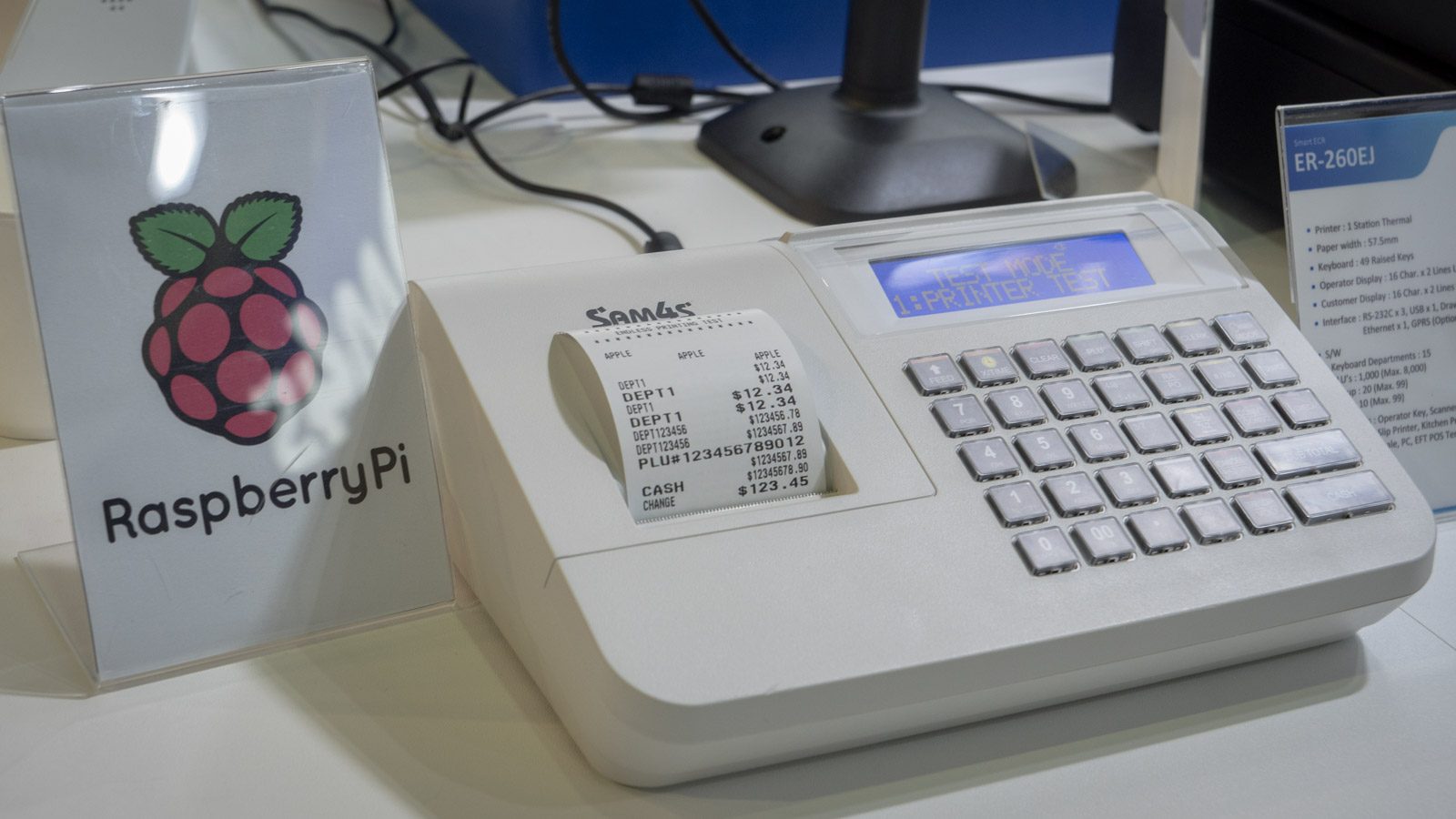 Pourquoi développer une électronique sur mesure quand on peut intégrer une carte mère à tout faire et s’épargner les coûts de développement, de production et d’entretien ? L’entreprise coréenne Sam4S s’est posé la question et a décidé d’expérimenter en utilisant un Raspberry Pi dans un de ses modèles de caisse enregistreuse. « C’est un test, mais si cela fonctionne, le Raspberry Pi est assez puissant pour intégrer toutes nos machines », nous a-t-on expliqué sur le stand. Ou comment un projet d’ordinateur à bas coût dédié à l’éducation fini par séduire les industriels.