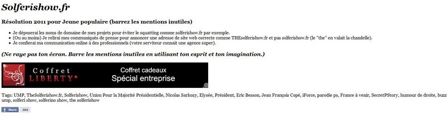 Si l’adresse thesolferishow.fr a bien été réservée, solferishow.fr, sur laquelle a communiqué le collectif dans un premier temps, ne l’était pas. Un facétieux internaute s’est dépêché de le faire. Il y a laissé un message à destination des jeunes du Mouvement populaire. En 2011, « je déposerai les noms de domaine de mes projets pour éviter le squatting, comme solferishow.fr par exemple. (Ou au moins) Je relirai mes communiqués de presse pour annoncer une adresse de site Web correcte comme THEsolferishow.fr et pas solferishow.fr (le “the” en valait la chandelle) ».