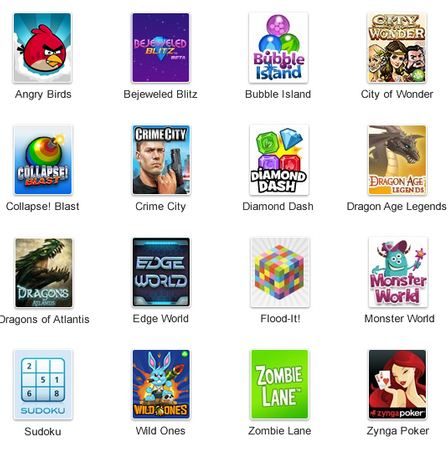 Seize titres sont disponibles au lancement, dont quelques standards comme Angry Birds, Bejeweled, Zynga poker (de l’éditeur de Farmville) ou encore le Sudoku. La fonction est en cours de déploiement auprès des membres de la communauté.