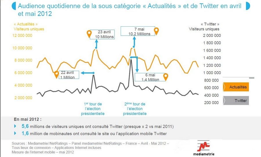 Les sites d’actualité ont été consultés par 10,2 millions de visiteurs uniques le 6 mai 2012, à l’occasion du second tour de l’élection présidentielle. C’est le record de l’année pour cette catégorie. De même, Twitter a connu ce jour-là son pic d’audience en France, avec 1,4 million de visiteurs uniques. Deux semaines auparavant, la question qui agitait les médias était de savoir si quelqu’un se risquerait à annoncer les résultats avant 20 heures… finalement, ce sont les Twittos qui ont dévoilé les premiers résultats avec un certain humour.