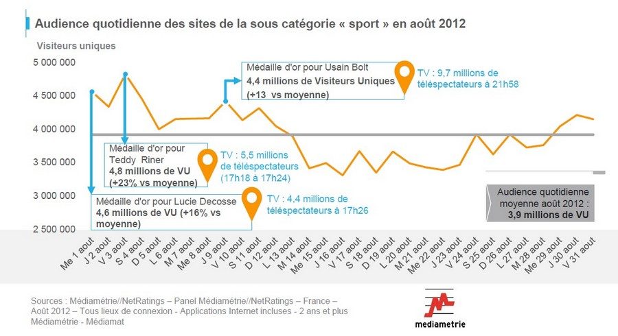 Autre temps fort de l’année, les jeux Olympiques, qui ont également passionné les internautes avec un pic d’audience à la télévision et sur Internet le 3 août dernier pour la médaille d’or de Teddy Riner, qui a attiré près de cinq millions d’internautes, soit 23 % de plus qu’un jour moyen du mois d’août. Cet événement a également suscité l’engouement des mobinautes et des utilisateurs d’iPad. Sur l’ensemble du mois, six millions de personnes ont suivi l’actualité sportive sur leur téléphone mobile et au 2e trimestre 2012, un million l’ont fait sur iPad.