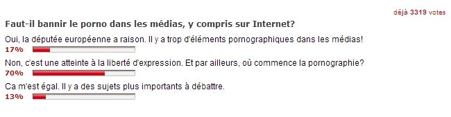 La semaine dernière, une parlementaire européenne a suggéré, dans un rapport, d’interdire le porno dans les médias, ce qui avait provoqué un tollé sur le Net. Le sondage publié par 01net dans la foulée confirme cette impression. Plus de 3300 votes ont été déposés, preuve qu’il s’agit d’un sujet qui a passionné nos lecteurs. Parmi eux, plus de 70 % sont contre une telle interdiction, contre 17 % qui sont pour et 12 % qui n’y accorde aucune importance.