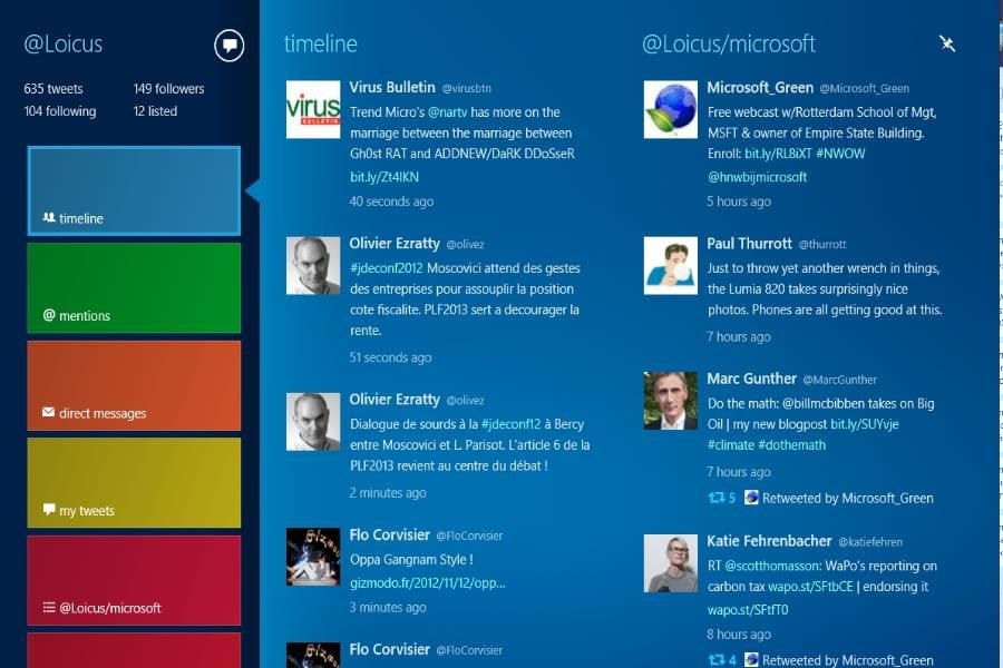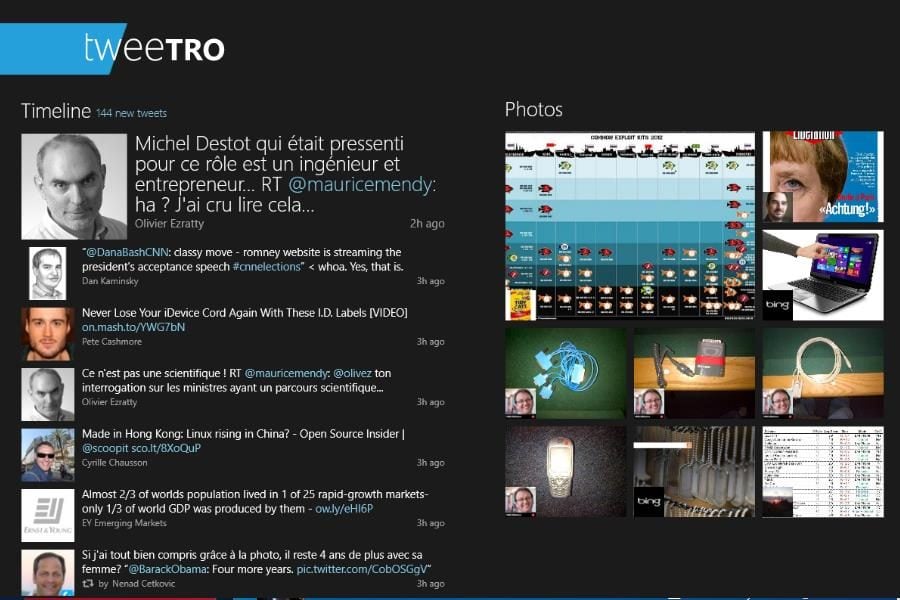 Tweetro est l’autre client phare de l’univers Windows 8. L’app est plus visuelle et plus tactile que MetroTwit, mais il en résulte une ergonomie différente de ce à quoi on est habitué, ce qui pourra décontenancer les Twitter-maniaques mais séduire les débutants. L’app est d’ailleurs truffée de bonnes idées comme une gestion intelligente des modes portrait et paysage, une rubrique Photos qui regroupe en un écran tous les envois de clichés et l’intégration d’un volet de navigation Web.