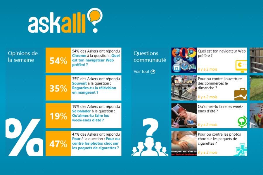 Et si c’était le réseau social de l’année ? AskAlll est l’un des trop rares réseaux sociaux créés par des Français et susceptibles d’avoir une répercussion internationale. L’idée est toute simple : vous avez une question ? Interrogez donc la planète pour savoir ce qu’elle en pense ! Il suffit simplement de définir sa question avec ses réponses possibles (question à choix multiple), puis d’attendre que la communauté des « Askers » y réponde. L’app est un peu limitée pour l’instant, mais le réseau social offre toute une gestion d’affinités au potentiel très instructif.