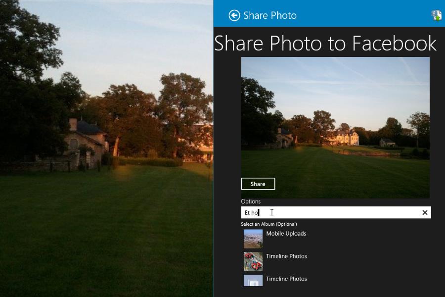 Si vous publiez très fréquemment des photos sur Facebook, cette petite app peut s’avérer bien pratique au quotidien. Elle s’installe dans le talisman Partager de Windows 8 et permet la publication directement depuis l’app Photos de Microsoft ainsi que depuis la plupart des apps de retouche d’images. Sans prétention mais plutôt utile en l’absence d’une app Facebook officielle.