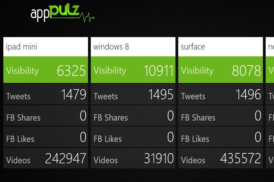 Voici une app très original pour les petits curieux. AppPulz permet de saisir des termes et de vérifier leur popularité à travers les différents réseaux en vous indiquant la visibilité du terme, le nombre de tweets sur ce sujet, le nombre de partages Facebook, le nombre le « Like » Facebook ainsi que le nombre de vidéos. On peut ensuite explorer les éléments comptabilisés pour consulter les différents commentaires publiés sur les réseaux sociaux.