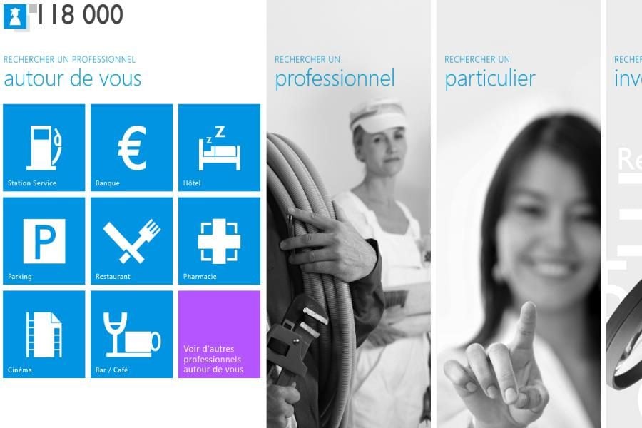 Plutôt plus visuelle et plus complète (mais peut-être un peu moins originale) que l’app de son concurrent PagesJaunes, l’app du service 118000 propose une recherche à la fois sur les annuaires professionnels et particuliers, mais aussi une recherche en annuaire inversé à partir d’un numéro de fixe. Les occurrences s’affichent à la fois sur une carte et sous forme de tuiles donnant les informations clés (distance, téléphone, etc.). Elle s’insère aussi dans le talisman Rechercher, pour vous éviter d’avoir à quitter votre travail en cours pour chercher l’info.
