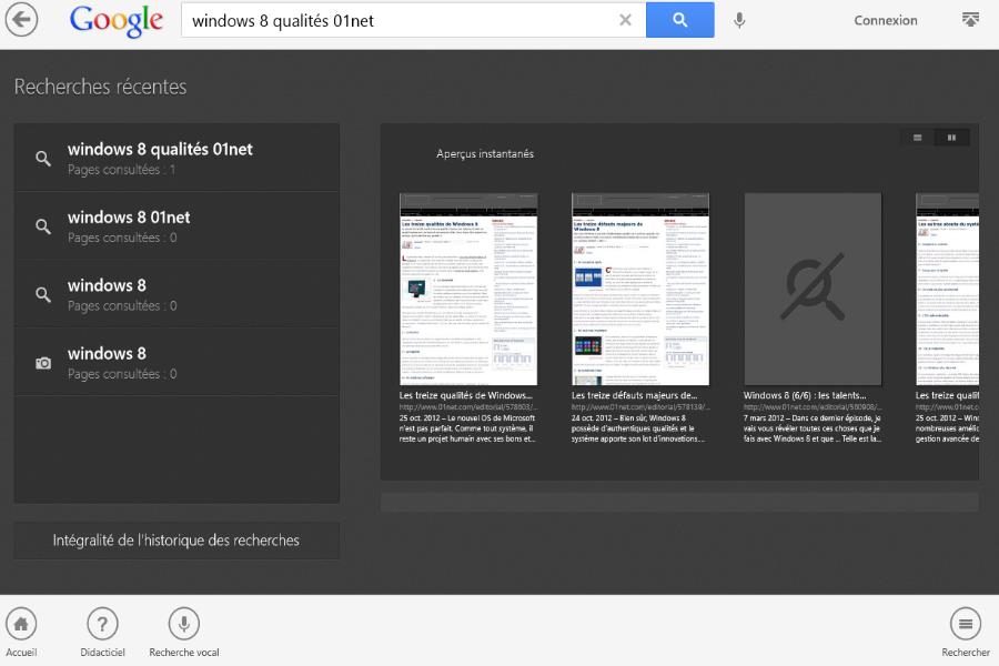 En attendant que Chrome fasse son apparition sous l’environnement tactile, Google propose une première app qu’il ne faut surtout pas considérer comme un navigateur mais comme un raccourci vers les services Google et comme un outil de recherche qui prend tout son sens lorsqu’on l’exploite avec les talismans Rechercher et Partager. En outre, on y trouve quelques trouvailles ergonomiques et visuelles que l’on espère retrouver un jour dans Chrome W8.