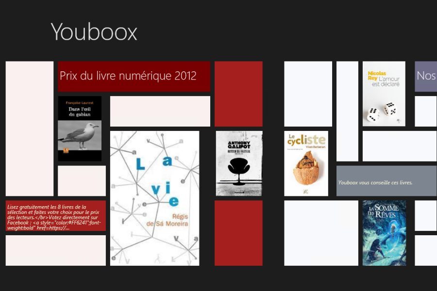 Les « petits » Français de YouBoox méritent un double coup de chapeau. D’abord, ils proposent des milliers d’eBooks en lecture gratuite et illimitée, le service utilisant la publicité pour rémunérer éditeurs et auteurs (mais il existera bientôt une offre Premium pour les allergiques à la pub). Ensuite, leur app est l’une des plus belles du Windows Store. Toutefois, elle ne fonctionne actuellement qu’en mode connecté et ne possède pas assez de réglages de personnalisation des polices et fonds.