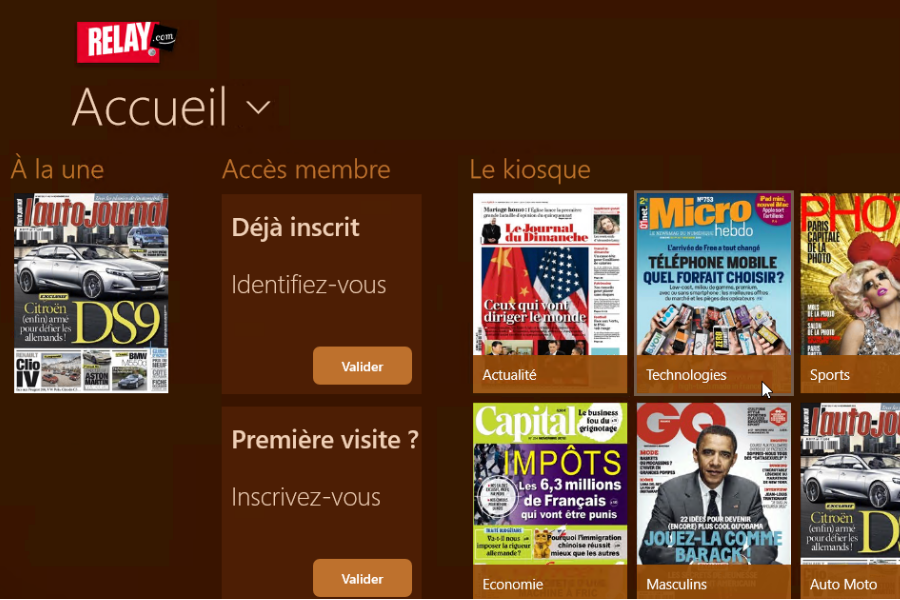 Le grand format des tablettes Windows (et autres ultrabooks hybrides à écrans tactiles) se prête aussi parfaitement à la lecture des magazines. Et cela tombe bien puisque Relay.com propose, d’ores et déjà, une app « Le Kiosque Relay pour Windows 8 ». Si vous utilisiez déjà ce service sur une autre tablette (iOS, Playbook ou Android), vous retrouverez directement les magazines déjà achetés. Rappelons que l’intérêt du service réside dans ses différentes formules d’abonnement qui permettent pour un coût minimal de télécharger plusieurs magazines par mois. Étrangement, la version Windows RT n’est pas encore disponible.