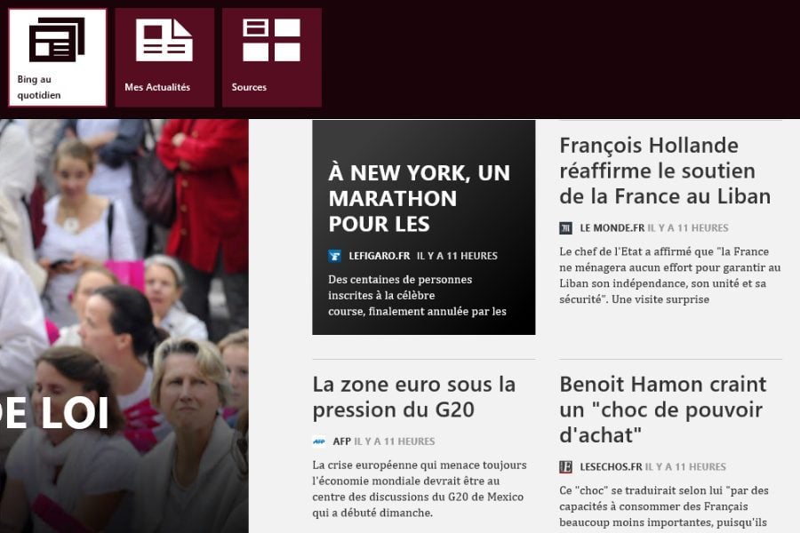 Au premier coup d’œil, Bing Actualités ressemble à un lecteur RSS bien fichu. Et lorsqu’on creuse un peu, on constate qu’il se révèle plus profond qu’il n’en a l’air. Très visuel, il regroupe automatiquement pour vous les meilleurs papiers de la presse quotidienne et du Web. Mieux encore, vous pouvez à l’aide de mots-clés lui demander de vous créer une édition totalement personnelle et centrée sur vos seuls sujets d’intérêt.