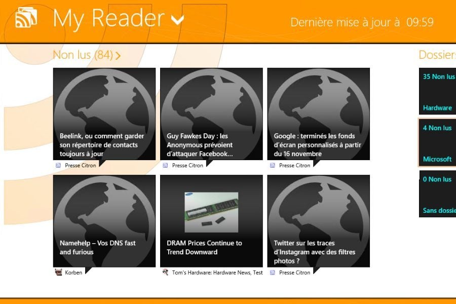 Il existe plus d’une centaine de lecteurs RSS sur le Store, certains consacrés à des sites bien particuliers, d’autres plus généralistes tels ce MyReader qui offre l’avantage d’être à la fois complet et gratuit. Il peut notamment synchroniser plusieurs comptes Google Reader, supporte le talisman Partager (pour s’abonner facilement aux flux depuis les sites Web) et le talisman Rechercher, etc. L’affichage est visuel mais peut perturber l’utilisateur qui souhaite quelque chose de plus classique. En outre, l’app est pour l’instant incompatible avec la double-authentification Google.