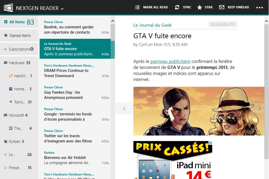Pour un lecteur RSS, cette app n’est pas donnée ! Toutefois, sa version d’évaluation est illimitée dans le temps (mais affiche des pubs contrairement à la version payante). Ce lecteur de flux, qui s’appuie sur le mécanisme d’abonnement de Google Reader, se révèle très agréable à l’usage, rapide, et offre différents modes d’affichage pour se conformer aux préférences de chacun. Elle possède de nombreux réglages de personnalisation et l’affichage complet des articles se fait soit directement depuis l’app, soit via le navigateur IE10.