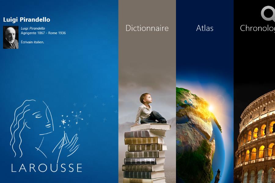 Les dictionnaires se multiplient sous Windows 8 profitant des talismans Partager et Rechercher qui apportent une convivialité accrue. C’est notamment le cas de l’app Larousse illustré avec son dictionnaire complet (avec synonymes et expressions), son atlas mondial de 200 cartes, ses conjugaisons et même ses jeux. Nous avons ici sélectionné Larousse parce qu’il s’agit d’une véritable encyclopédie interactive, mais deux dictionnaires méritent également d’être portés à votre attention : Le Petit Robert et Cordial.