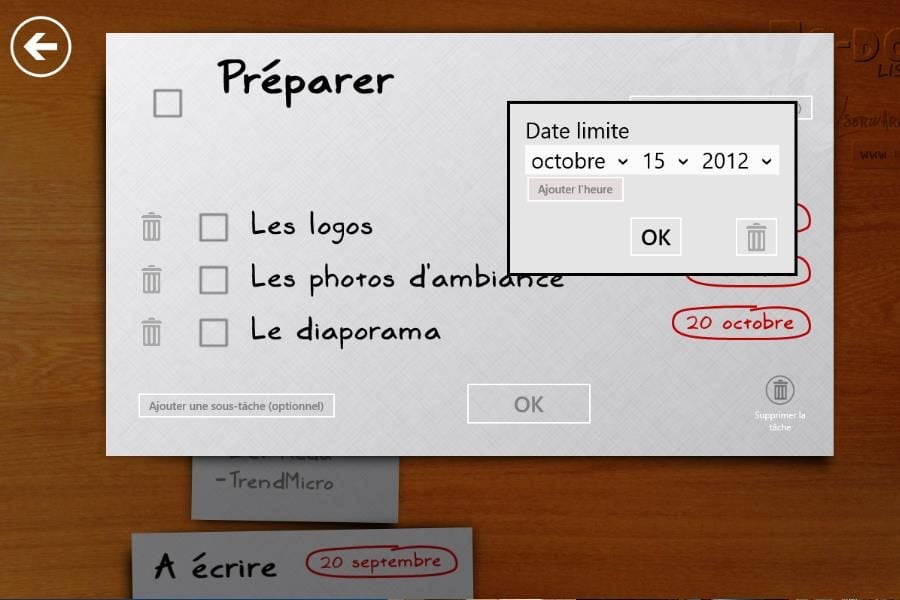 Les applis façon « Post-It » sont très nombreuses sur le marché applicatif de Windows 8. Nous avons sélectionné celle-ci parce qu’elle possède une interface très visuelle, permet de définir des deadlines pour chaque tâche primaire et tâche secondaire, et parce qu’elle est l’œuvre de développeurs français. Deux regrets toutefois, l’app exploite insuffisamment l’espace offert par un affichage en paysage et ne réalise pas de synchronisations d’une machine à l’autre via votre compte Microsoft. Mais on peut espérer des évolutions prochaines corrigeant ces défauts.