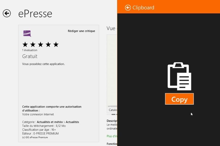 Clipboard est un petit utilitaire sans prétention mais vraiment très pratique pour permettre au monde tactile et Bureau de communiquer. Il utilise le talisman Partager pour vous permettre de copier/coller à peu près n’importe quoi entre une app et un logiciel du Bureau. C’est par exemple l’outil que nous utilisons pour récupérer l’URL d’une app sur le Windows Store, puis la coller dans Word sur le Bureau.