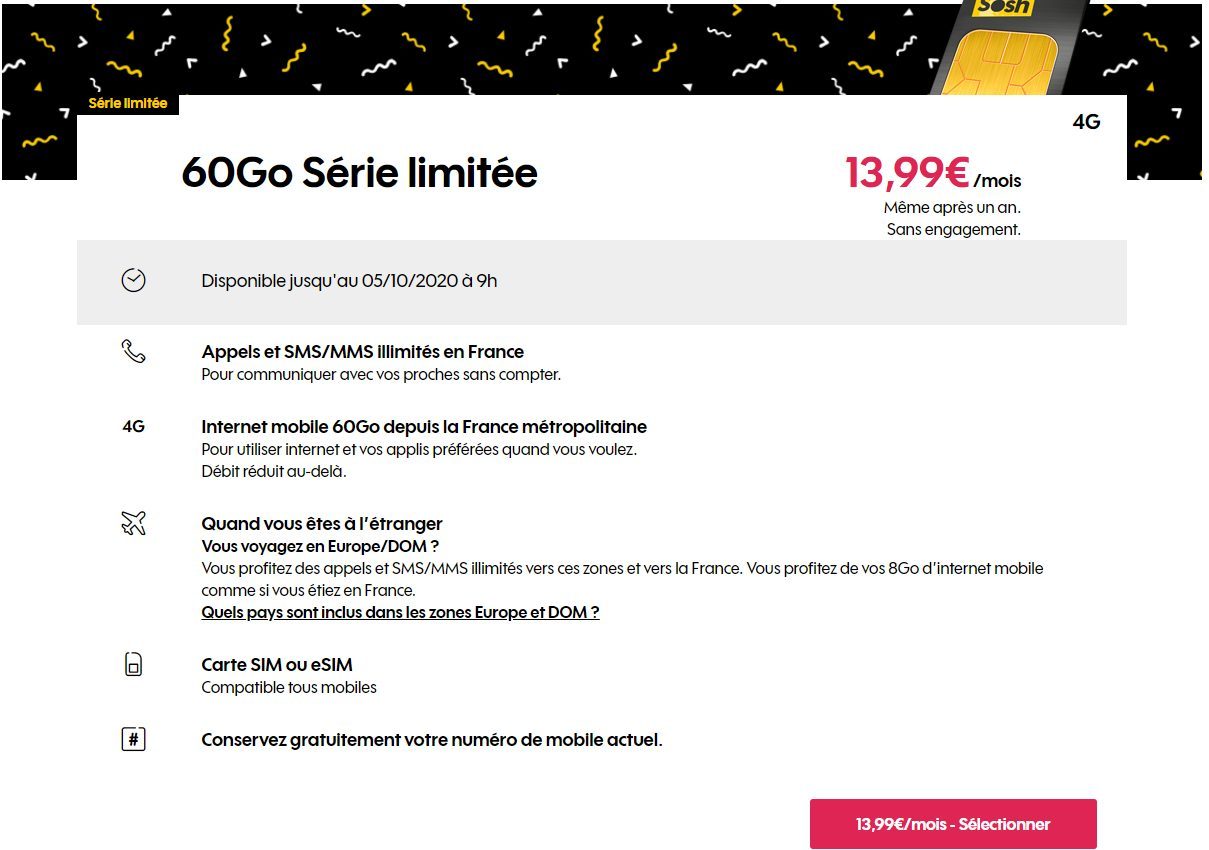Le forfait mobile Sosh Série Limitée 60 Go à 13,99 euros par mois