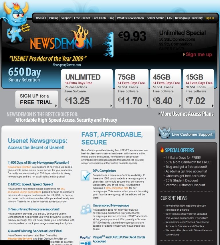 Les FAI ne proposant pas d’accès à ces fameux fichiers – à l’exception notable de Free* –, il faut, pour télécharger sur Usenet, souscrire un abonnement auprès d’un fournisseur d’accès à ces temples du piratage. Il existe des dizaines de providers, tous ont pignon sur Web, et, même s’ils ne parlent jamais ouvertement de piratage, font clairement de bonnes affaires avec. Qu’ils s’appellent EasyNews, Giganews ou encore NewsDemon, tous rivalisent d’ingéniosité pour attirer les internautes vers leur offre. Et ils ont des arguments massue : longue rétention des fichiers, téléchargement ultrarapide, sans oublier la « sécurité » de leurs utilisateurs. Comprenez par là que la plupart offrent des connexions sécurisées (SSL) afin d’empêcher les curieux de voir ce que vous téléchargez et d’éviter que les données de connexion soient conservées.