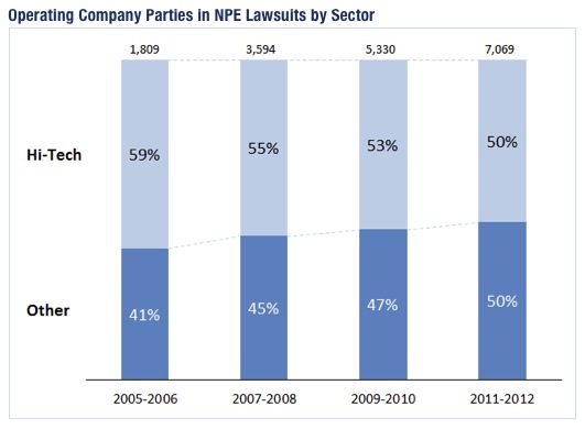 Dans l’industrie générale, les high-tech sont une cible de choix comme le dévoile PatentFreedom, mais l’écart avec les autres secteurs se réduit. Entre 2005 et 2006, les entreprises IT représentaient 59% des affaires. Dans la période 2011-2012, les high-tech sont à égalité avec le reste de l’industrie.